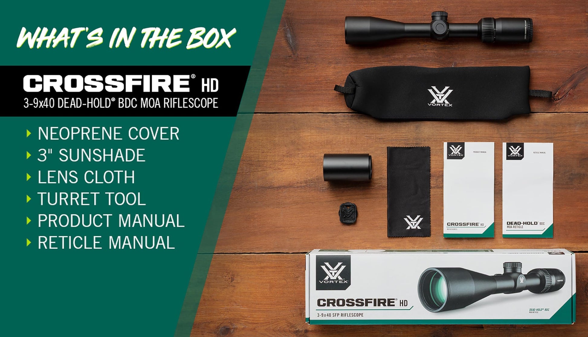 Whether in dense timber or dialing in at extended range, Crossfire HD delivers sharper detail and improved light transmission, giving you the confidence to own any hunt.The Crossfire HD 2-7x32 Second Focal Plane riflescope has an HD Optical System that uses select glass elements to deliver sharp resolution, reduces chromatic aberration, and provides excellent color fidelity with edge-to-edge clarity.Fully multi-coated lenses feature anti-reflective coatings on all air-to-glass surfaces to enhance light transmission and improve clarity in low-light conditions.The V-Plex is a popular, all-purpose hunting reticle for a wide variety of applications.The fast focus eyepiece quickly adjusts your reticle focus for quick target acquisition, whether you're in timber or at the range.Built from aircraft-grade aluminum with a low-glare matte black anodized finish; waterproof, fogproof, and shockproof for lasting field performance.Backed by our unlimited, unconditional, lifetime, VIP Warranty. A fully transferable promise to repair or replace your item if it becomes damaged/defective. Does not cover loss, theft, deliberate damage or cosmetic damage that doesn't hinder performance.