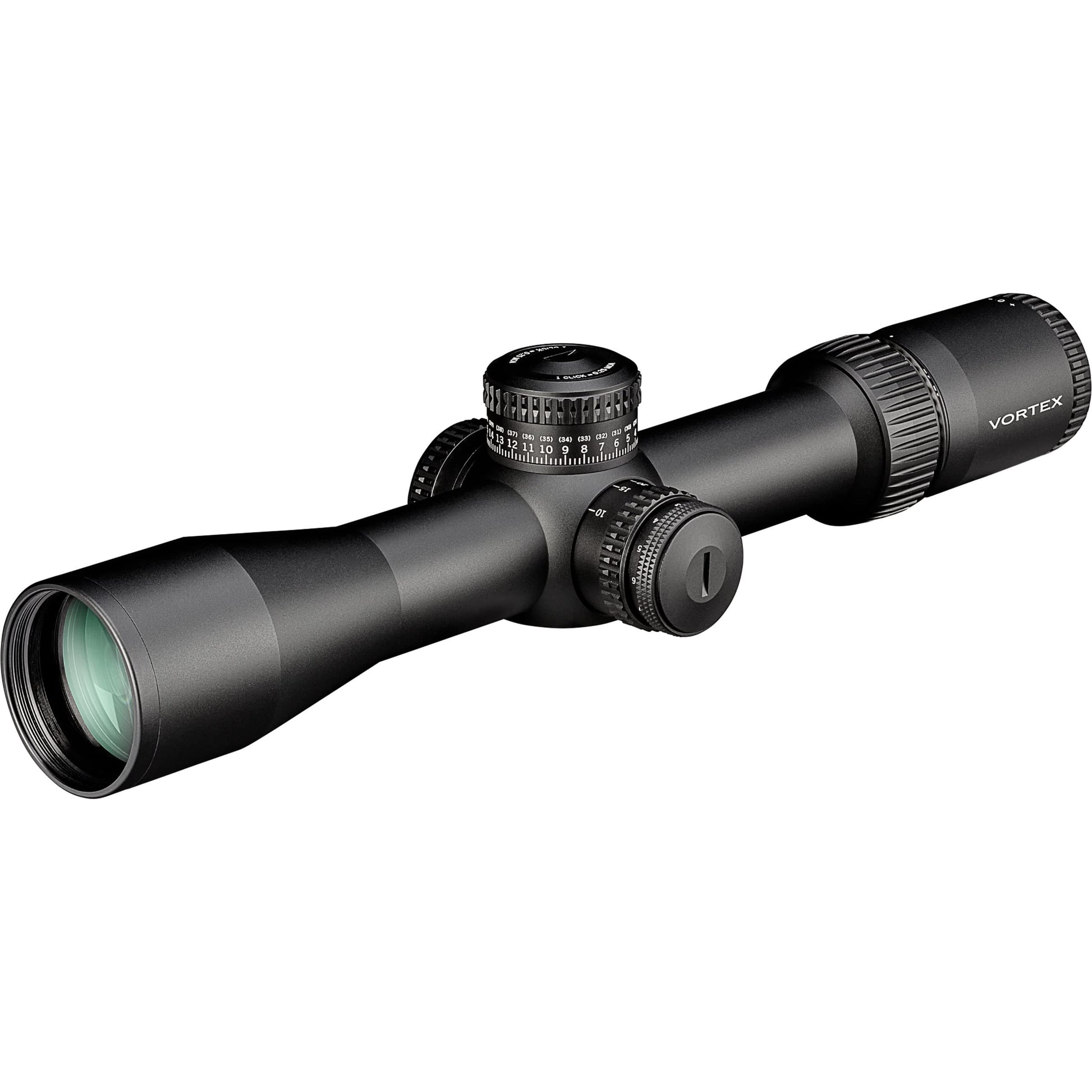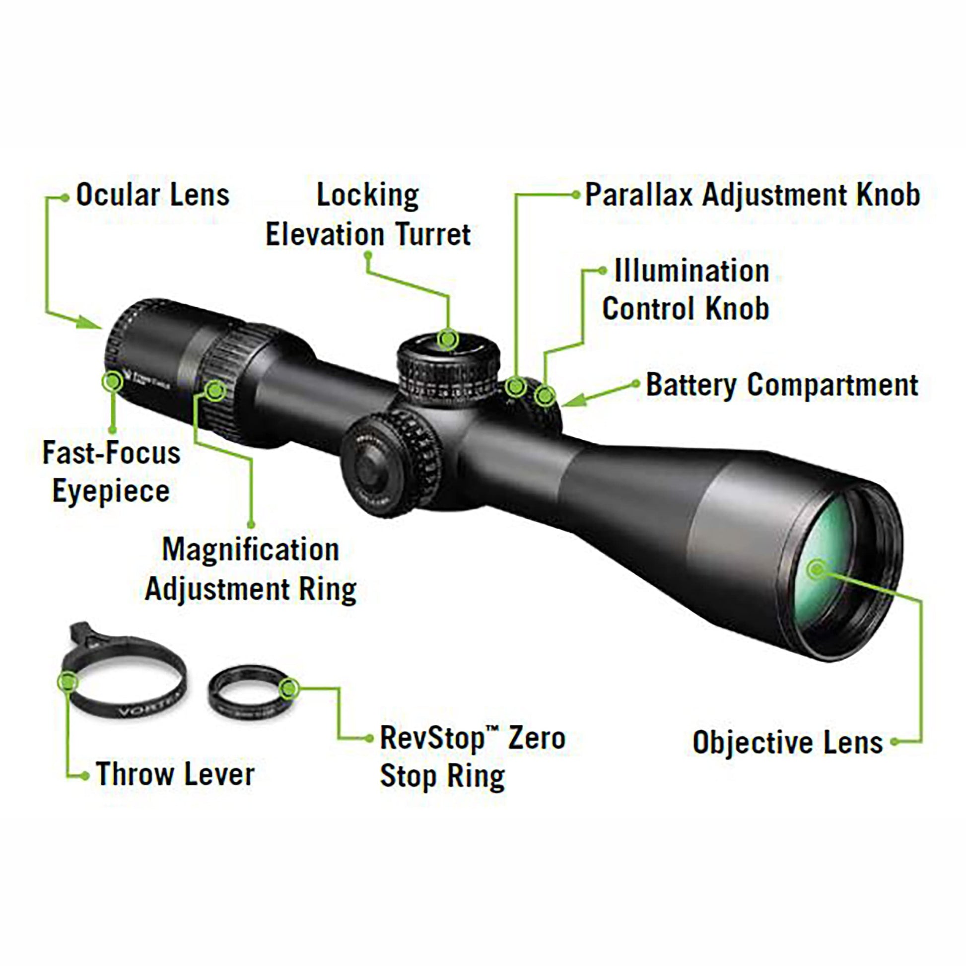 Vortex Optics Strike Eagle 3-18x44 First Focal Plane Riflescope - EBR-7C Reticle (MOA)The Strike Eagle 5-25x56 First Focal Plane (MRAD) riflescope provides the features needed to improve your long distance shooting.XD Optical System delivers impressive resolution, edge-to-edge sharpness and greatly reduces chromatic abberation. Anti-reflective coatings on all air-to-glass surfaces provide superior light transmission for exceptional clarity and low-light performance.The RevStop Zero System offers an easy to set, rock-solid return to zero after turret adjustments. Tactical locking turrets prevent accidental adjustments and provides fast, accurate adjustments.An illuminated reticle eases use in low light and against dark backgrounds. The included throw lever can be installed for quick and easy magnification adjustments.The scopes are nitrogen purged and o-ring sealed the for water and fogproof performance. The one-piece, aircraft grade aluminum, 34mm tube is shockproof, shrugging off recoil and other impacts.Backed by our unlimited, unconditional, lifetime, VIP Warranty. A fully transferable promise to repair or replace your item if it becomes damaged/defective. Does not cover loss, theft, deliberate damage or cosmetic damage that doesn't hinder performance.